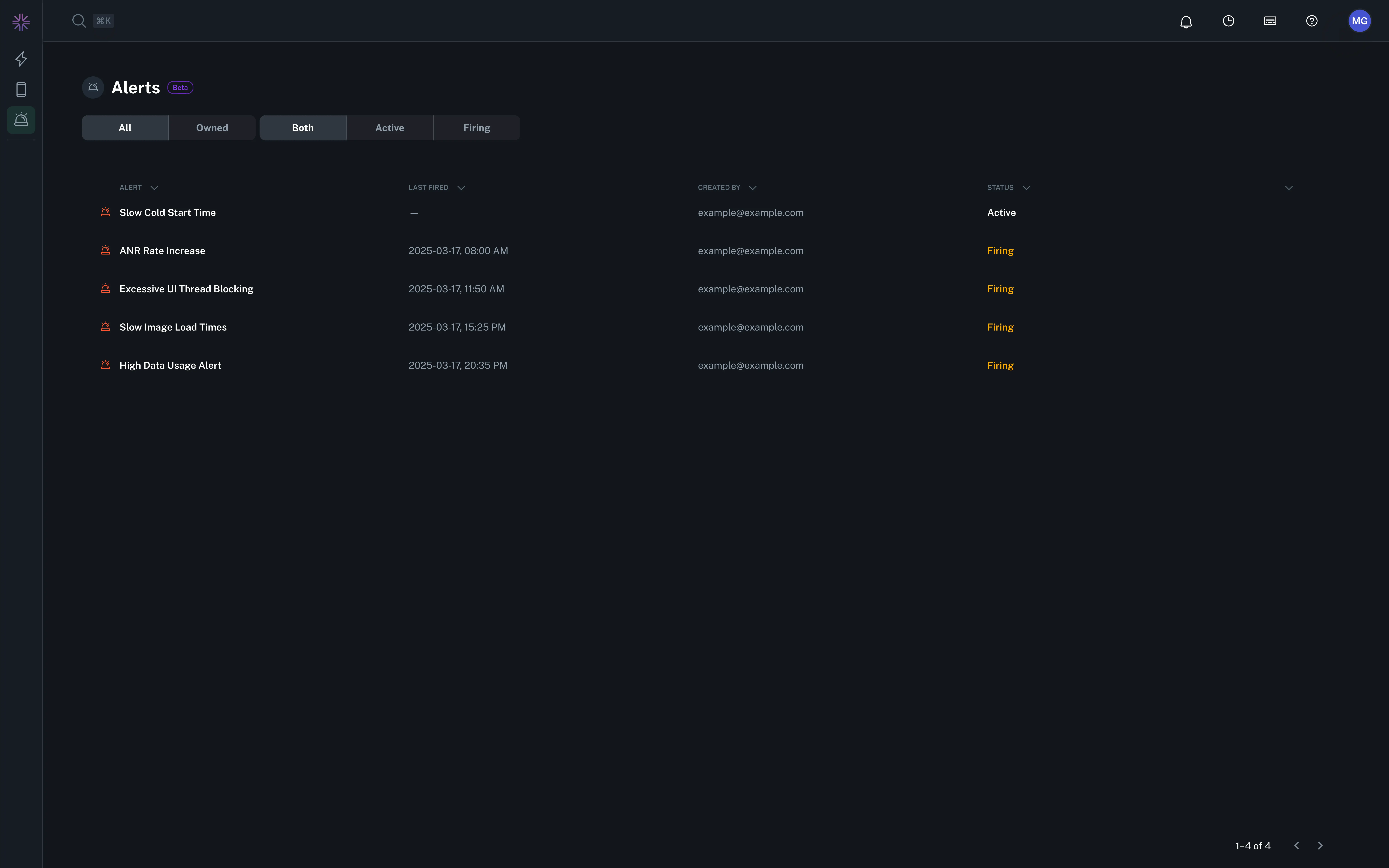 The Alerts Home Page lets you monitor and filter alerts by status and ownership. It displays details such as the last fired timestamp, the user who created the alert, and its current status. You can also disable, edit, or delete alerts as needed.