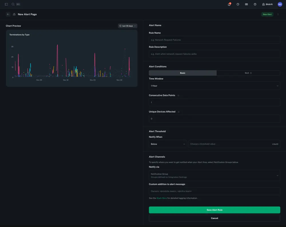 @bitdriftSlack app into the channel(s) you want to send the notification to. - Configure a notification group that will select which channel will the notification fire into.