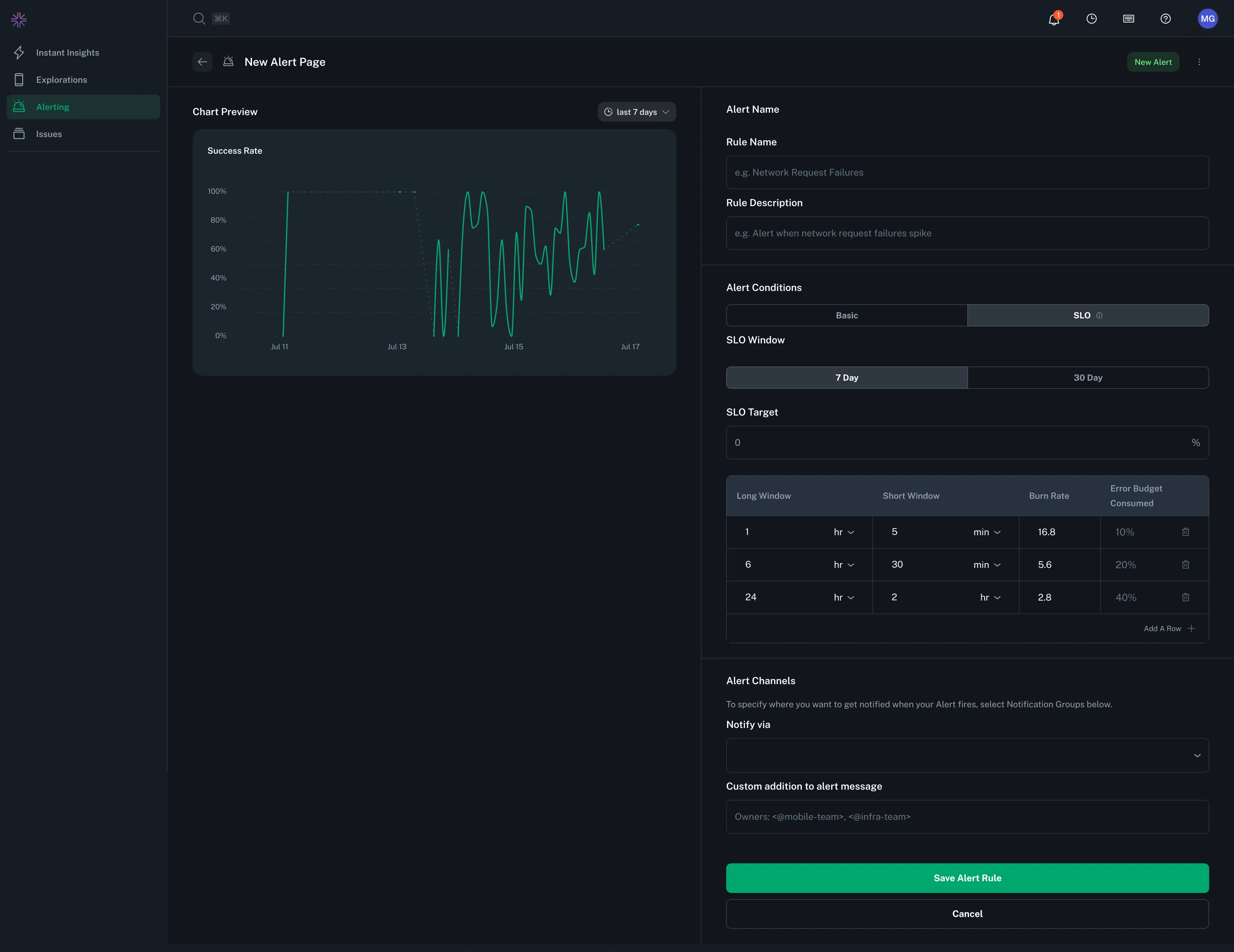This is useful when you want different escalation paths based on severity. For example: - High burn rate alerts (fast error budget consumption) → Page on-call engineers - Lower burn rate alerts (slower error budget consumption) → Send to general Slack channel