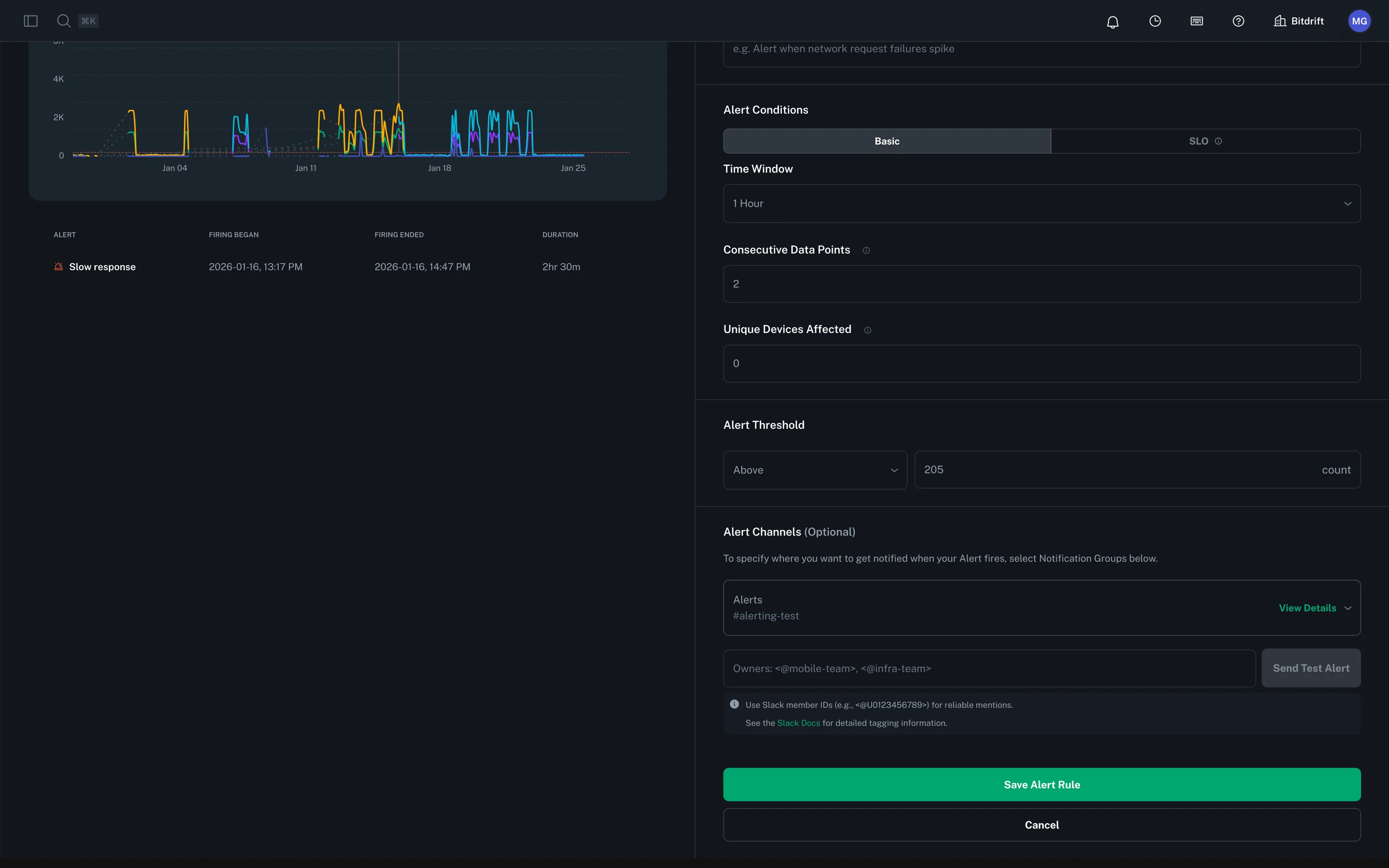 Enter the exact Slack notification that will be posted when the alert fires. • Message text: The custom text of your alert (e.g. “Error rate above 90% for service X”). • @mentions: Include any user or team pings using Slack’s mention syntax (e.g. <@U12345678> for a specific user, <!subteam^S12345|@dev-team> for a user group). For more info, check out the Slack mention syntax docs.