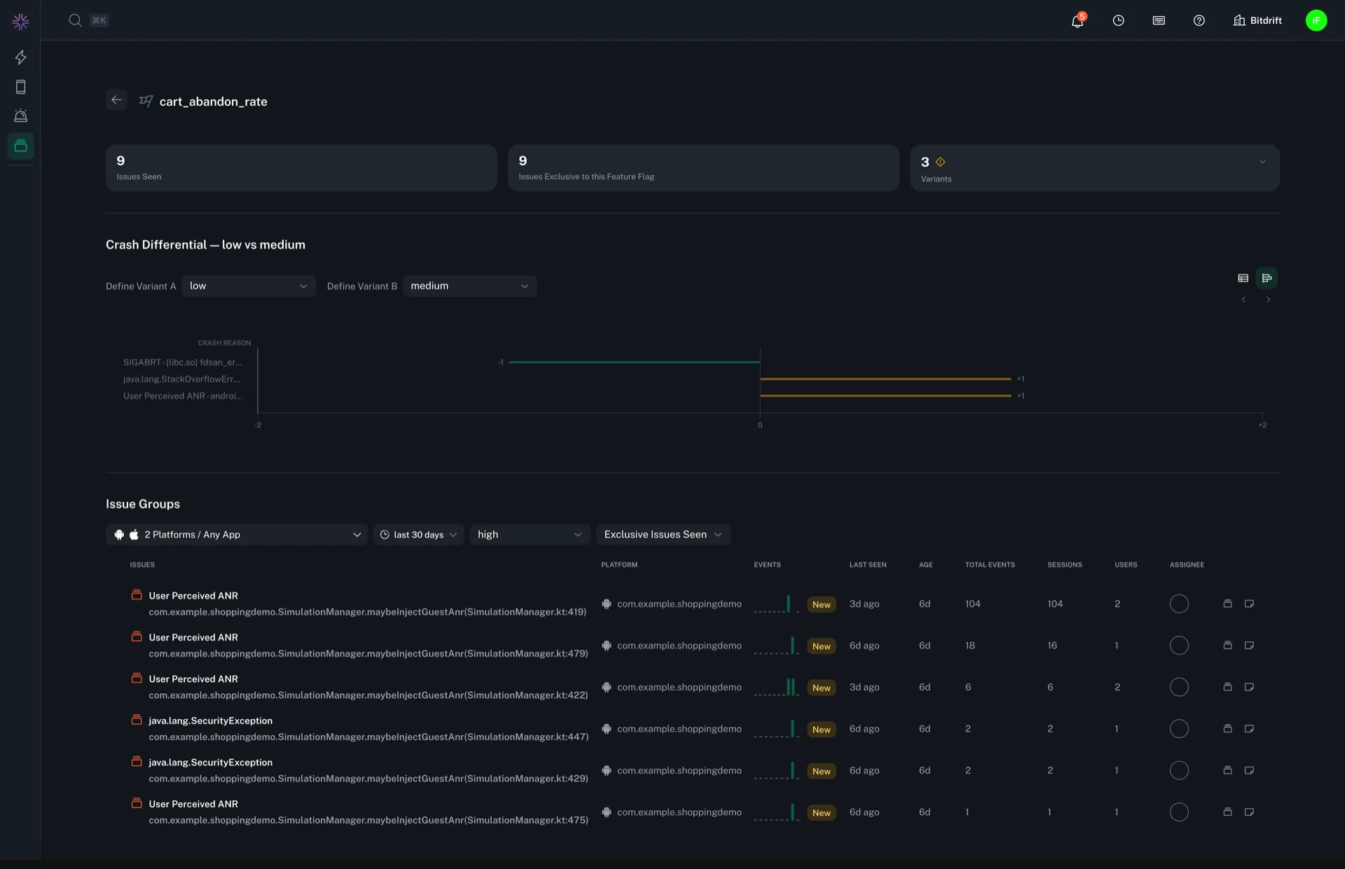 - Exclusive Errors — issue events seen only in groups where this flag was active