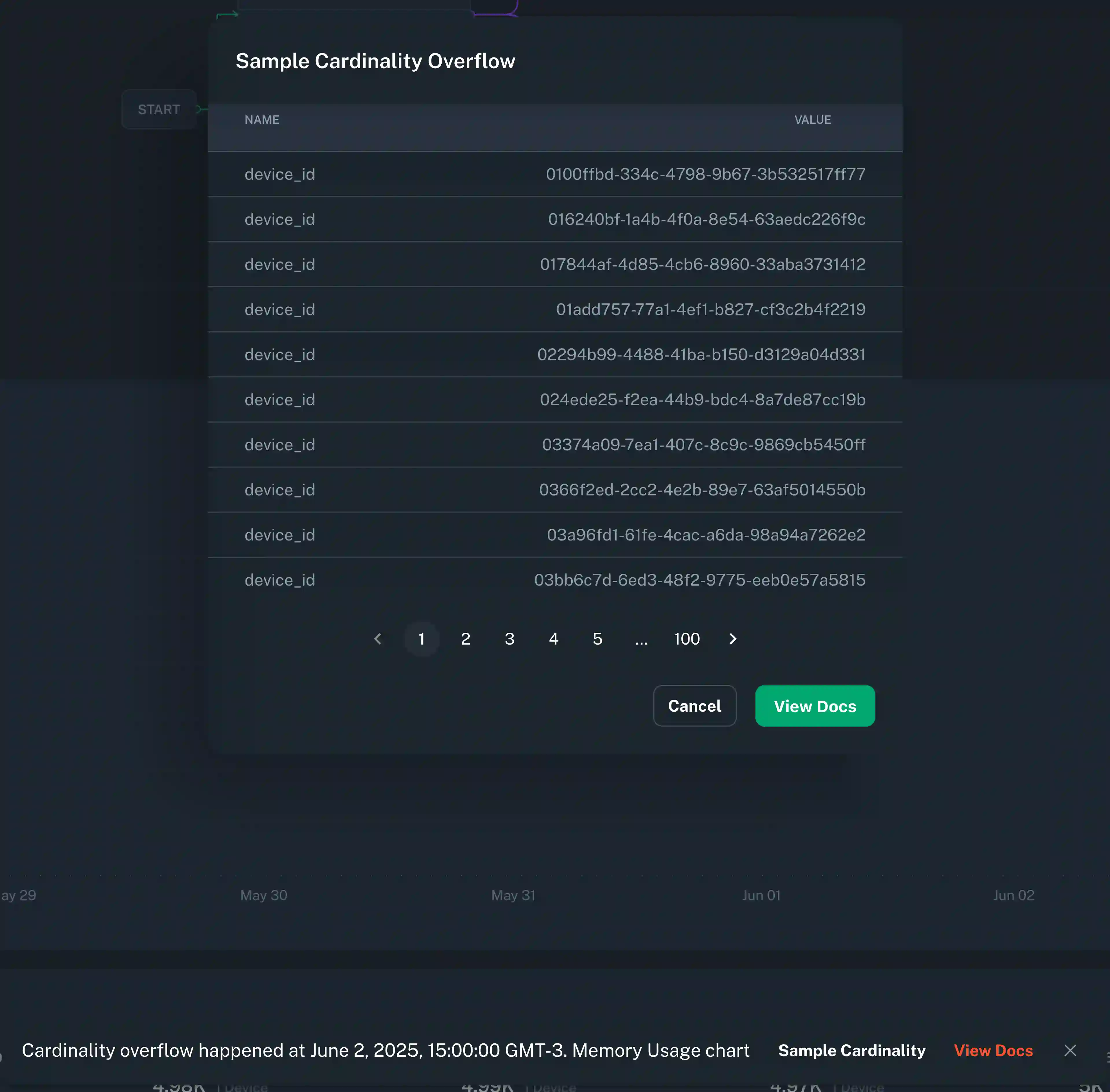 If any of these limits are hit, metrics will begin to be dropped. If metrics are dropped, a toast will be shown in the chart UI as shown below, and example cardinality can be inspected to understand how workflows should be adjusted to lower overall cardinality. Contact support if cardinality limits need to be increased for legitimate purposes.